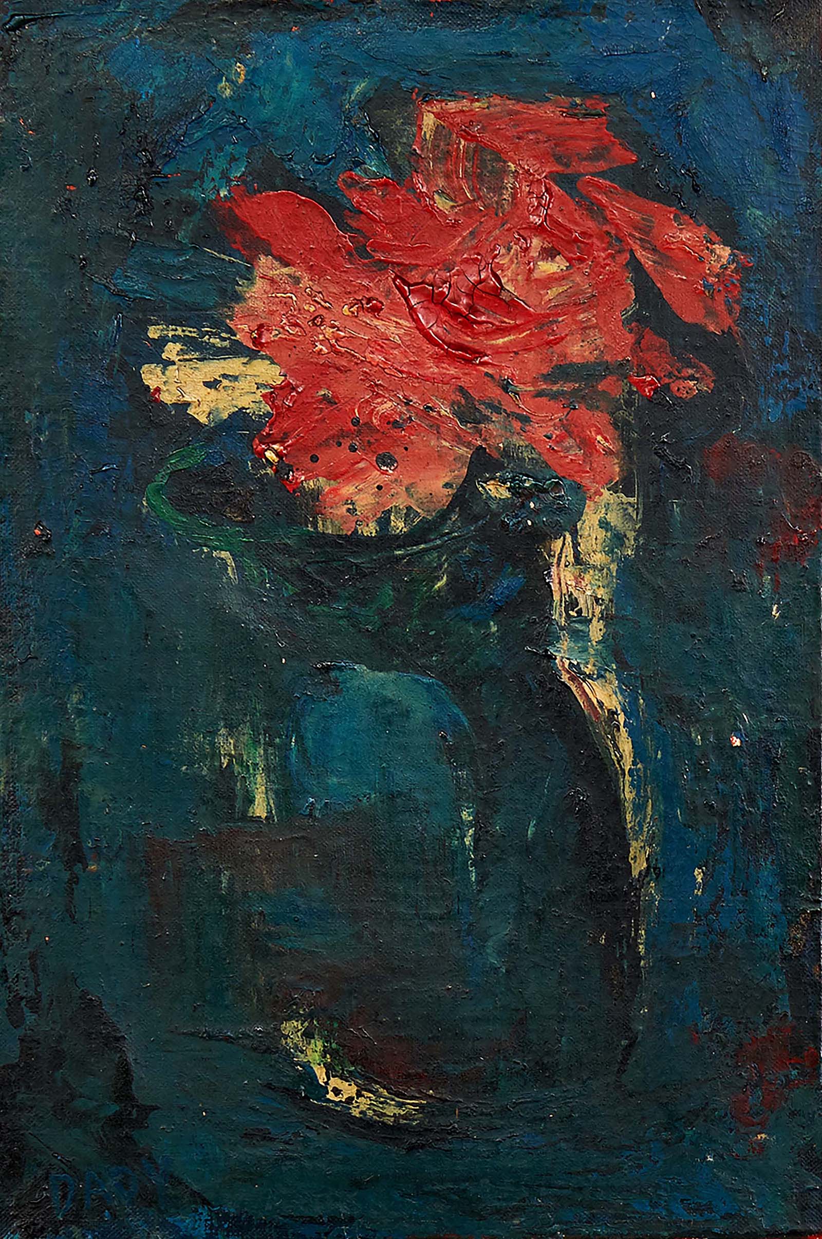 Alla fine degli anni Trenta Dady Orsi è diviso tra la vocazione artistica e il suo ruolo nell’esercito. Nel 1939 Orsi dipinge questa tela di piccolo formato, oscura e profonda, dove campeggia l’immagine di una rosa. Qui si prefigura tutto l’artista che verrà: i suoi blu e i suoi rossi, i suoi segni forti e l’amore per le cose delicate. La Rosa è un oggetto di contemplazione per il suo autore, che ama tenerlo sott’occhio nel proprio studio, quasi fosse un talismano che ne custodisse il lavoro. La rosa rossa è un elemento che compare ciclicamente sia nelle nature morte che come ornamento di figure femminili. Simbolicamente esprime il lato passionale dell’artista. Inusualmente materica, quest’opera a tempera dall’aspetto esplosivo e tormentato sembra presagio della guerra, nonché dei linguaggi informali che nasceranno nel corso degli anni Quaranta. La riduzione a due colori primari e la sintesi a un passo dall’astrazione caratterizzano anche gli artisti della Scuola di Pont Aven, amata dagli artisti di Corrente. Questo linguaggio prefigura la sintesi formale e cromatica che Orsi perseguirà in tutta la sua carriera di pittore. Il dipinto non verrà esposto al pubblico se non negli anni Novanta.