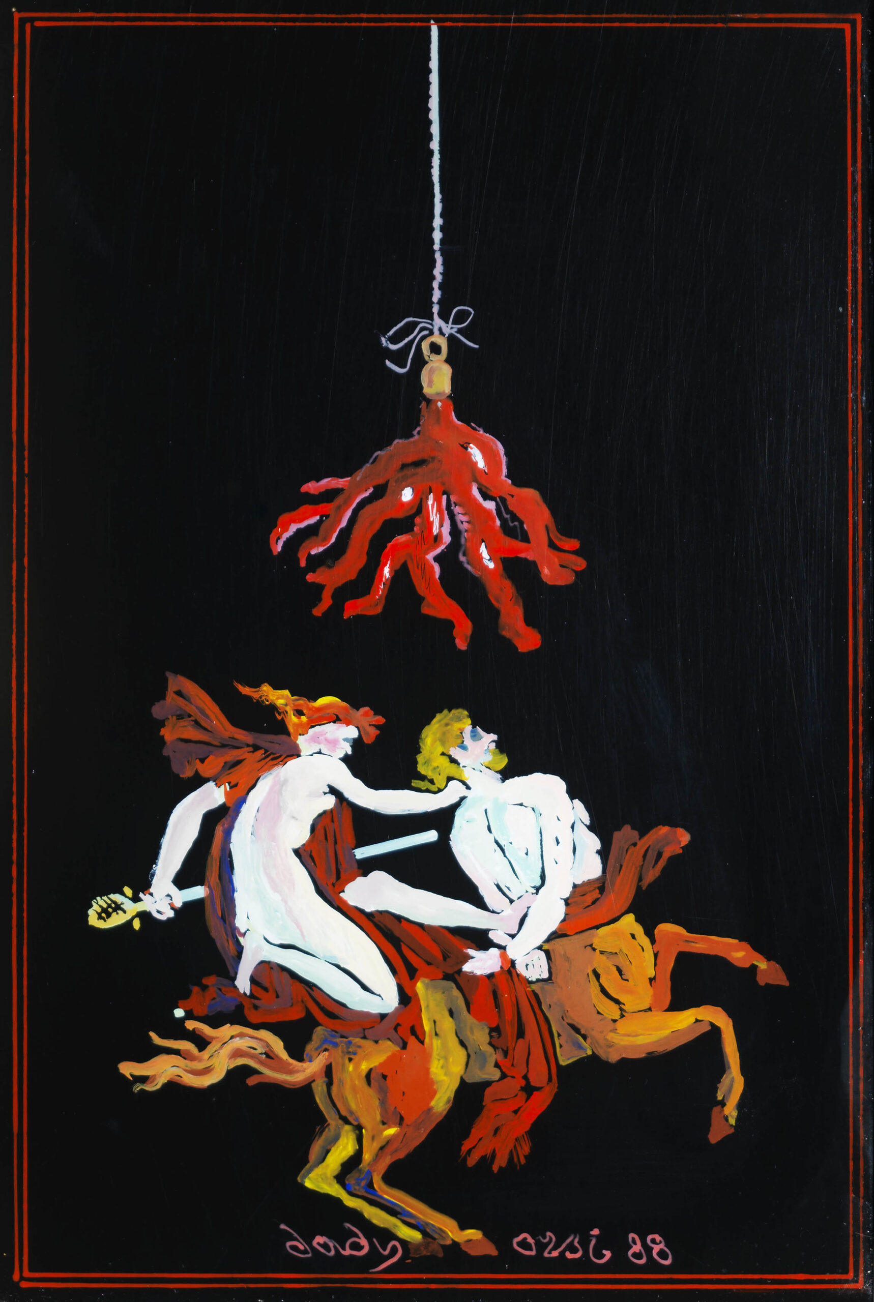 Tra gli artisti italiani del secondo Novecento, solo Dady Orsi ha prodotto dipinti sottovetro in quantità così significativa. Orsi vive la pittura sottovetro come un esercizio di meditazione (o un rituale) da svolgersi con la luce del primo mattino. Nell’ottica di questa dimensione meditativa la maggior parte di questi dipinti raffigurano soggetti simbolici e/o allegorie esoteriche come strumenti musicali (allegoria barocca della musica ridotta al silenzio), raggi di luce, chiavi e orologi. Altro soggetto rappresentato è quello del nudo accostato alla fragilità del vetro che può essere interpretato come un richiamo alla Vanitas, alla fragilità della vita umana. Tra i temi prediletti dall’artista nature morte di oggetti domestici, figure umane, volti distorti dall’anamorfosi e, soprattutto, stanze che, a partire dalla fine degli anni Sessanta, l’artista raffigura come ‘spazi’ mentali gremiti di racconti affascinanti, di ricordi d’infanzia e suggestioni dei sensi. Non semplici interni domestici, quindi, ma vere e proprie Wunderkammer. Pur avendo un aspetto cristallino che riflette la lucidità che l’esecuzione richiede, i dipinti sottovetro non sono fatti per essere guardati in trasparenza come le vetrate. La funzione del vetro è piuttosto quella di dare ai colori una lucentezza smaltata e specchiante. La tecnica richiede controllo e fermezza. L’immagine da dipingere deve essere così chiara nella mente da poter essere dipinta al contrario, in un arduo tour de force tecnico. Il termine inglese reverse glass painting descrive bene la peculiarità del processo, che avviene dipingendo il lato inferiore della lastra di vetro, partendo dai dettagli e da ciò che deve apparire in superficie per poi stendere mezzi-toni e sottofondi. Orsi è così esperto da saper riprodurre anche la tecnica tardoantica dell’oro graffito sottovetro. Finito il dipinto, il fondo steso a spray (quasi sempre nero) conferisce un’intonazione scura, creando così un contrasto concettuale tra la lucentezza del vetro e l’oscuro esoterismo dei simboli.