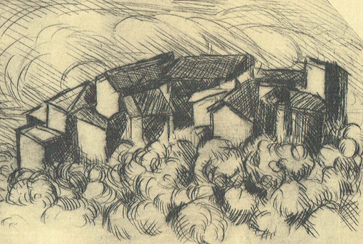 Qui siamo sul terreno dell’arte, evitiamo le forzature, le cose «che si tengono» le sentiamo in un ascolto attento della musica silenziosa delle forme create dall’artista. Se prima ho cercato (trovandolo?) un rapporto tra le matasse intrise di segni a tratto e un’idea d’albero residuo nel processo di trasformazione verso l’astrattezza, ora, retrocedendo nei ricordi mi vedo nell’uliveto insieme a Dady che, seduto su un seggiolino pieghevole, dipinge dal vero. Con i materiali preferiti, inchiostri corretti da tempera e acquarello poco diluito, e la nota rapidità d’esecuzione ottiene due figurazioni dinamiche; le piante sembrano vive, come frustate dal vento che non c’è. Le metto a confronto con Albero argentato di Mondrian: stupefacente la parentela, da noi ignorata in quel momento, anche se il quadro Mondrian è quasi in bianco e nero.